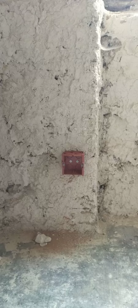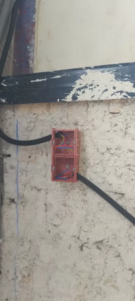 Mandin Marius a installer des boitiers de prises sur un mur en pierre pour une finition en enduit chaux/chanvre de 5 cm