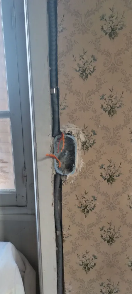Marius mandin a installé des gaines electriques sur un mur en pierre en procédant a des saignées.